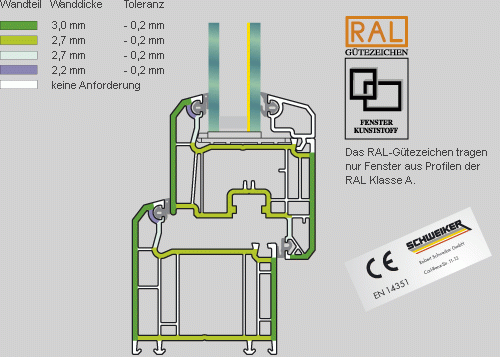 Die RAL Klasse A gibt die vorgeschriebenen Wanddicken inkl. Toleranzwerten des Fensterprofils an. Auch das verwendete PVC-Material ist exakt einzuhalten. Geringere Wanddicken (Klasse B) führen zur Minderung von Funktionsdauer und Lebenszeit.