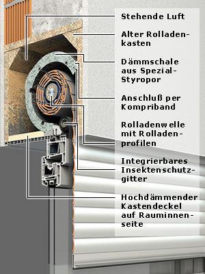 Die auf dem Fenster vormontierte Rollladenschale wird in den vorhandenen Sturz- oder Mauerkasten geschoben. Durch die Abdichtung nach vorne und den Kastendeckel entsteht ein hochisolierender Raum mit stehender Luft. Zusammen mit der Schale aus Spezial-Styropor erreicht das Bauteil optimale Dämmwerte